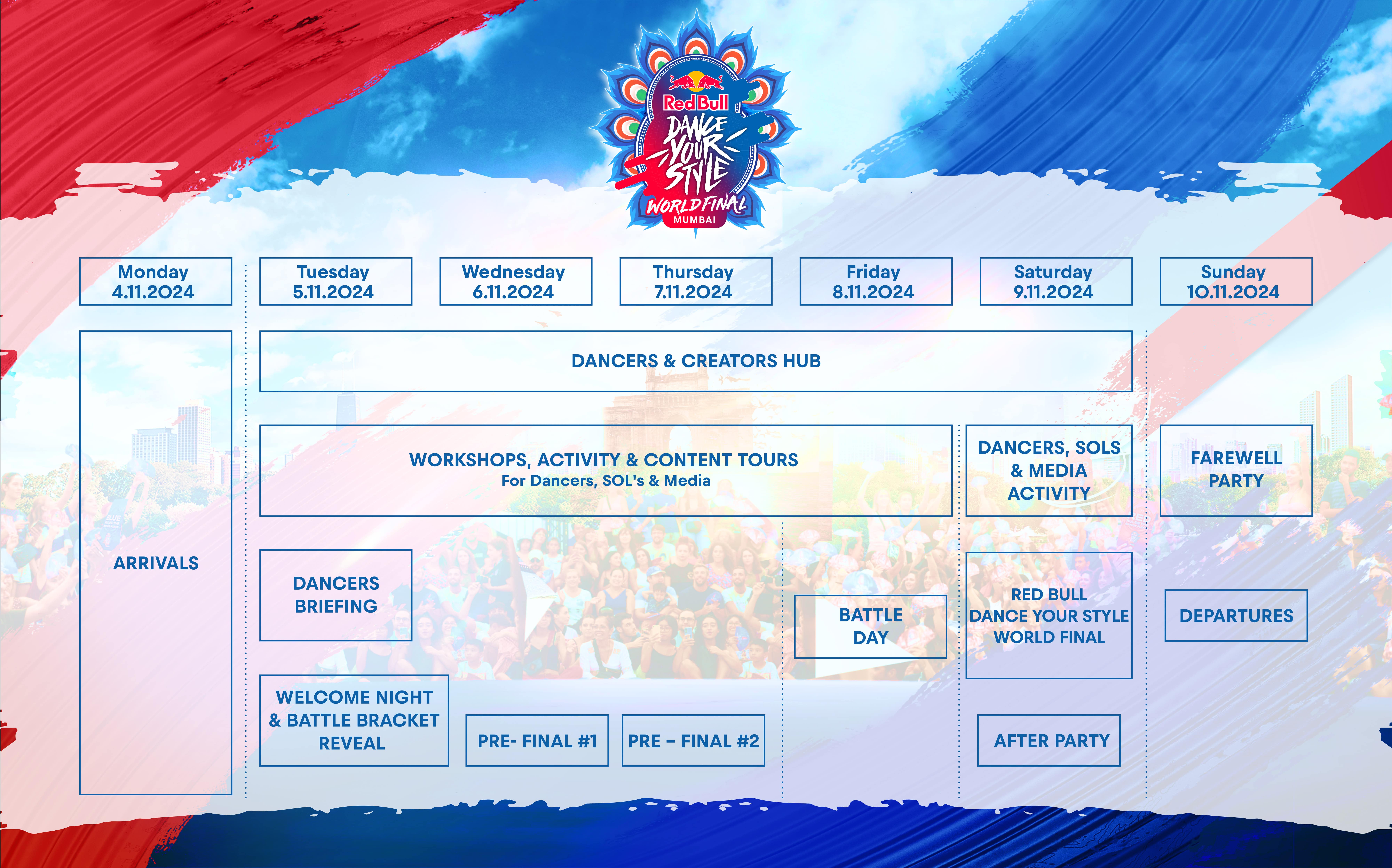 RED BULL DANCE YOUR STYLE WORLD FINAL 2024 makes its way to the diverse, vibrant, and eccentric city of Mumbai in November and we are excited to celebrate and dance away with you and your guests.